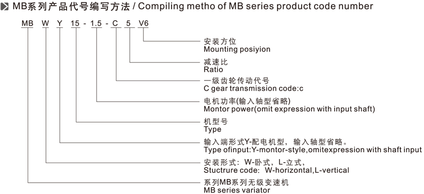MB系列無級變速機代號編寫方法有:MB W Y 15 - 1.5 - C 5 V6