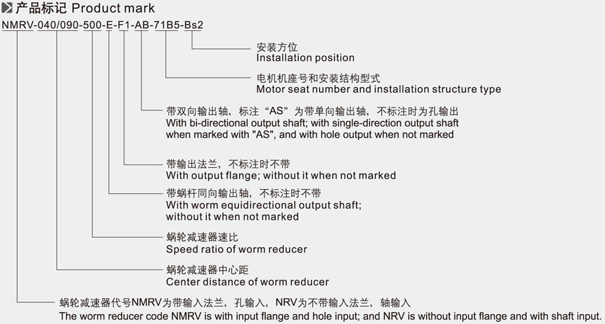 NMRV+NMRV雙蝸輪減速機(jī)的產(chǎn)品標(biāo)記有:NMRV-040/090-500-E-F1-AB-71B5-Bs2